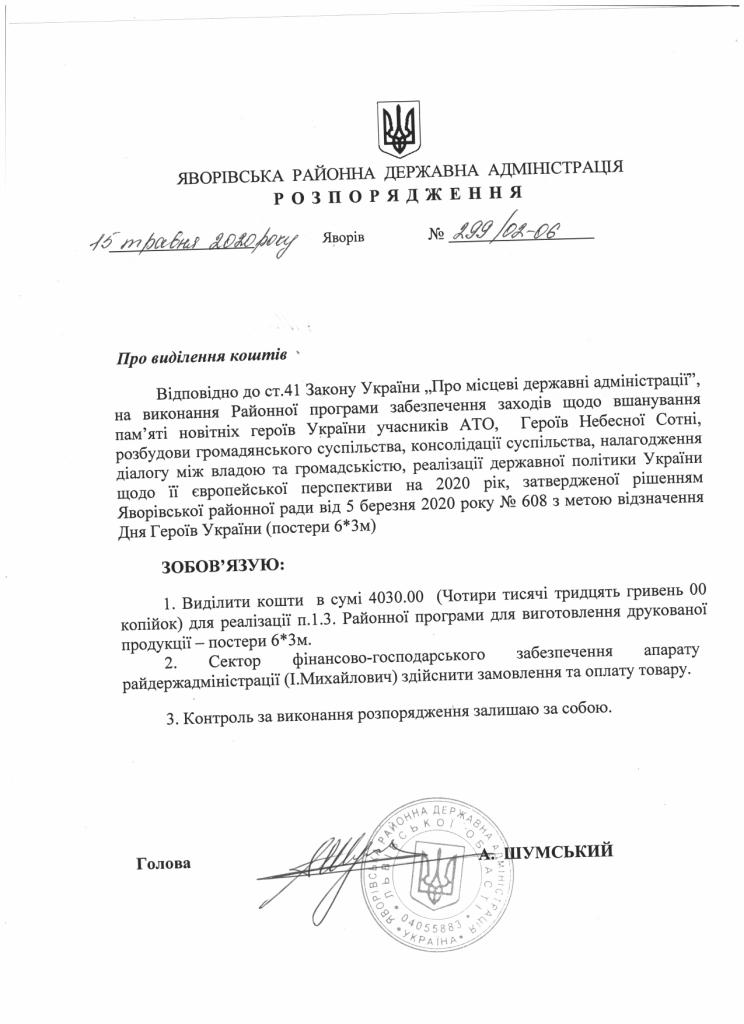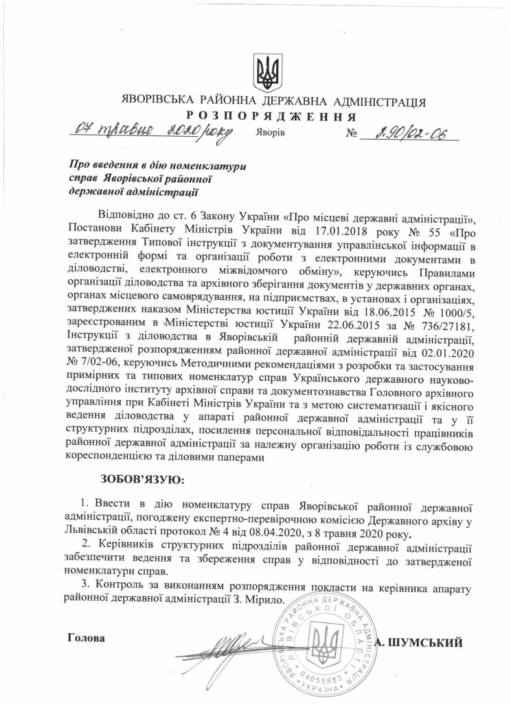290/02-06 2020-05-07 Про ведення в дію номенклатури справ Яворівської районної державної адміністрації