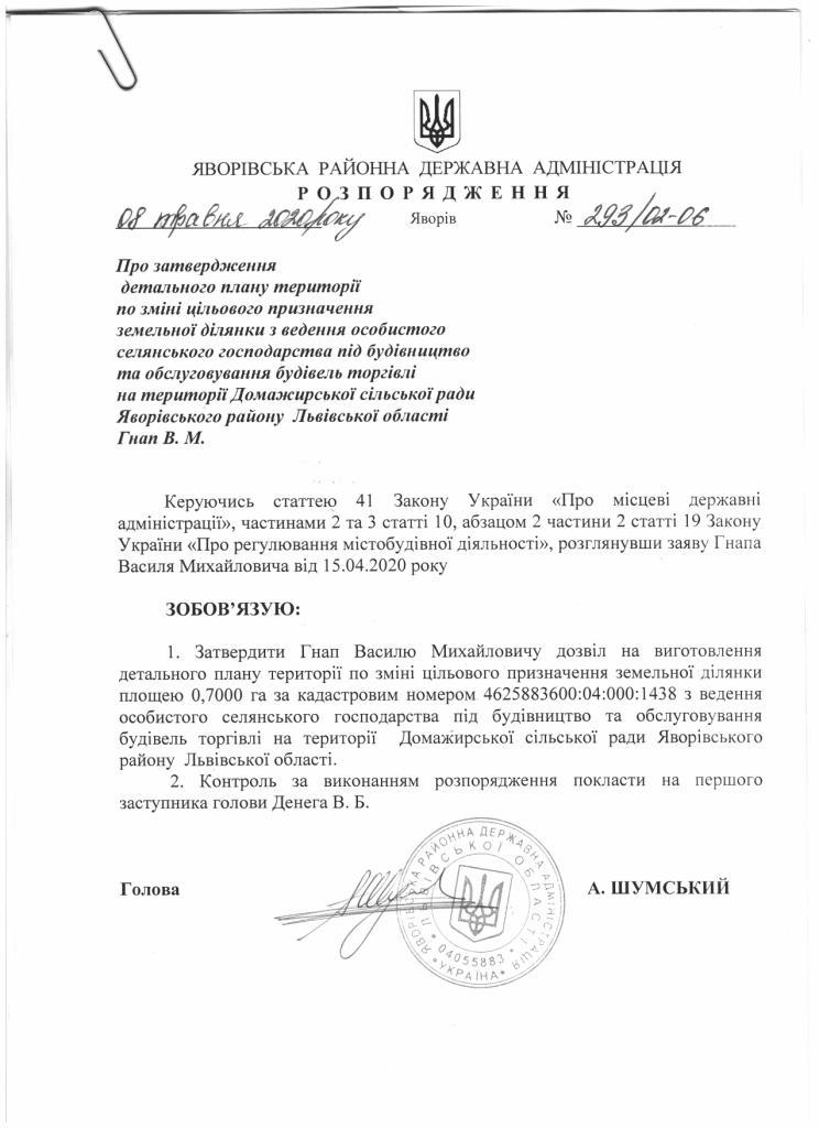 293/02-06 2020-05-08 Про затвердження детального плану території по зміні цільового призначення земельної ділянки з ведення особистого селянського господарства під будівництво та обслуговування будівель торгівлі на території Домажирської сільської ради Яворівського району Львівської області Гнап В.М.