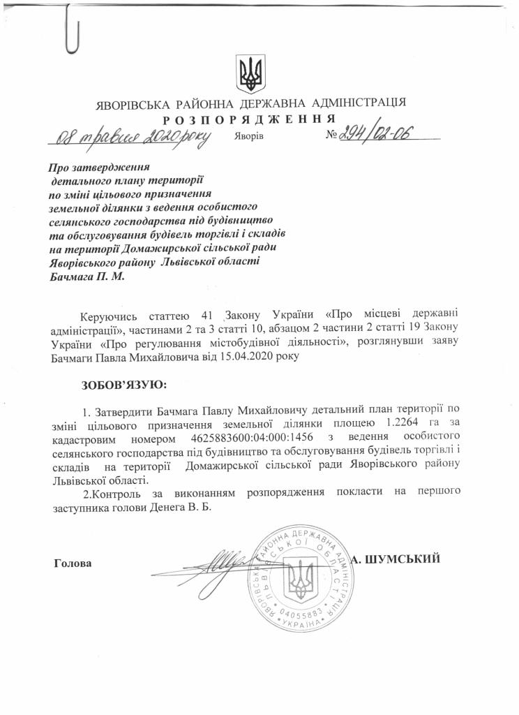 294/02-06 2020-05-08 Про затвердження детально плану території по зміні цільового призначення земельної ділянки з ведення особистого селянського господарства під будівництво та обслуговування будівель торгівлі і складів на території Домажирської сільської ради Яворівського району Львівської області Бачмага П.М.