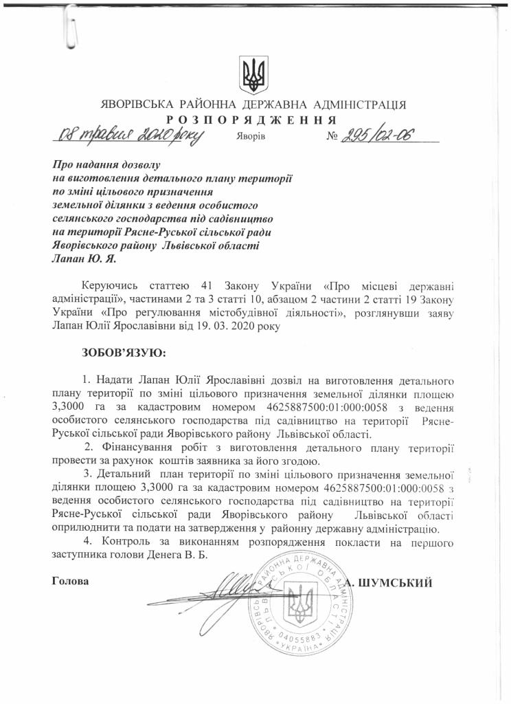 295/02-06 2020-05-08 Про надання дозволу на виготовлення детального плану території по зміні цільового призначення земельної ділянки з ведення особистого селянського господарства під садівництво на території Рясне-Руської сільської ради Яворівського району Львівської області Лапан Ю.Я.