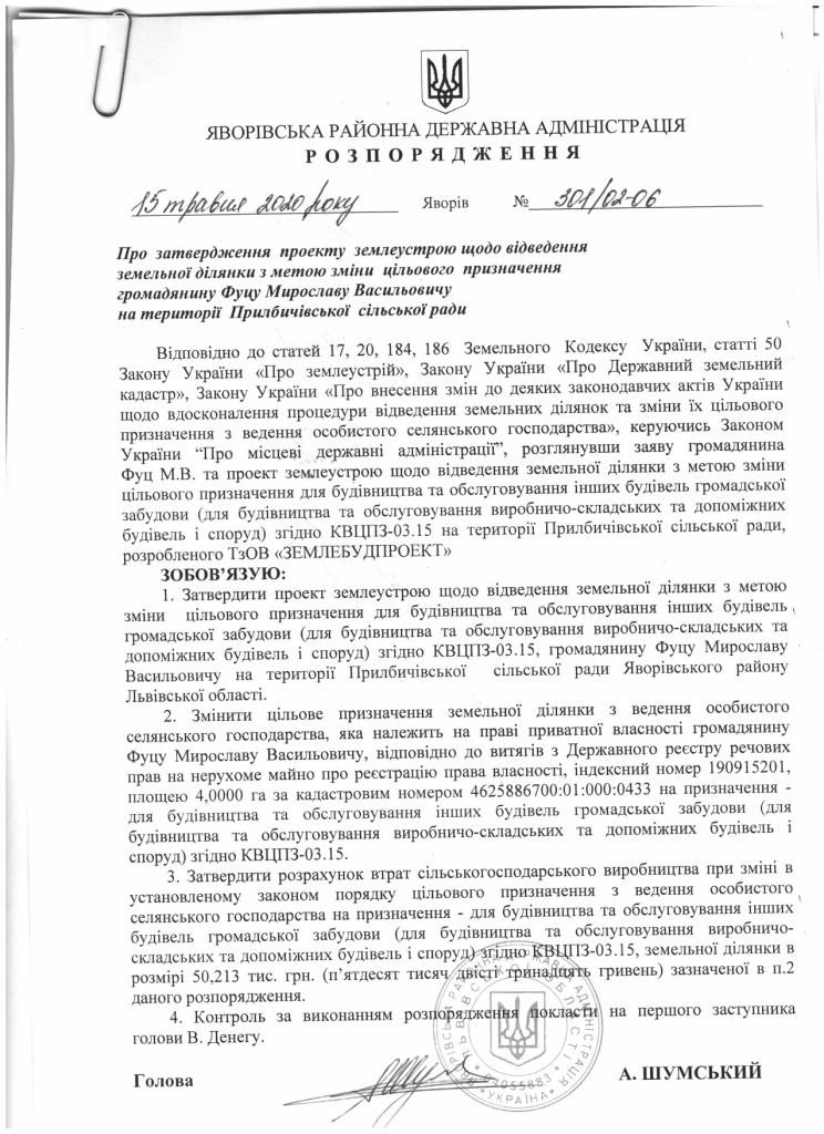 301/02-06 2020-05-15 Про затвердження проекту землеустрою щодо відведення земельної ділянки з метою зміни цільового призначення громадянину Фуцу Мирославу Васильовичу на території Прилбичівської сільської ради