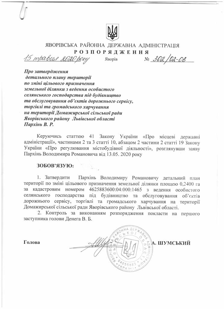 302/02-06 2020-05-15 Про затвердження детального плану території по зміні цільового призначення земельної ділянки з ведення особистого селянського господарства під будівництво та обслуговування об'єктів дорожнього сервісу, торгівлі та громадського харчування на території Домажирської сільської ради Яворівського району Львівської області Пархінь В.Р.