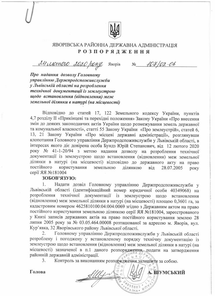 Про надання дозволу Головному управлінню Держпродспоживслужби у Львівській області на розроблення технічної документації із землеустрою щодо встановлення (відновлення) меж земельної ділянки в натурі (на місцевості) |