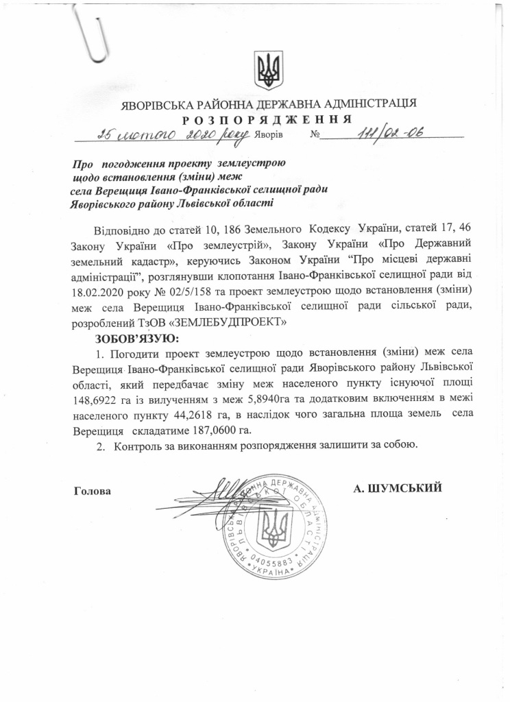 Про погодження проекту землеустрою щодо встановлення (зміни) меж села Верещиця Івано-Франківської селищної ради Яворівського району Львівської області |