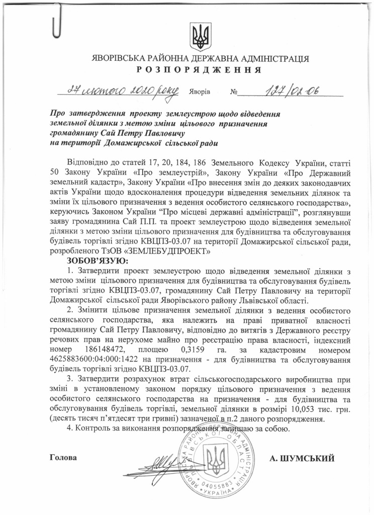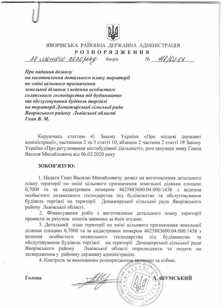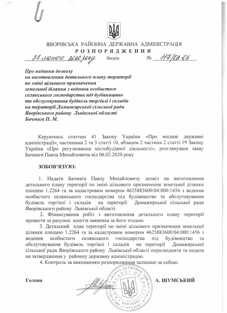 Про надання дозволу на виготовлення детального плану території по зміні цільового призначення земельної ділянки з ведення особистого селянського господарства під будівництво та обслуговування будівель торгівлі на території Домажирської сільської ради Яворівського району Львівської області |