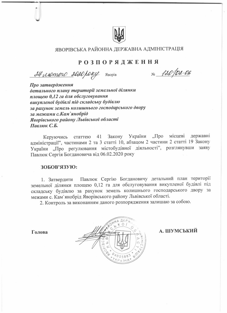Про затвердження детального плану території земельної ділянки площею 0,12 га для обслуговування викупленої будівлі під складську будівлю за рахунок земель колишнього господарського двору за межами с.Кам'янобрід Яворівського району Львівської області |