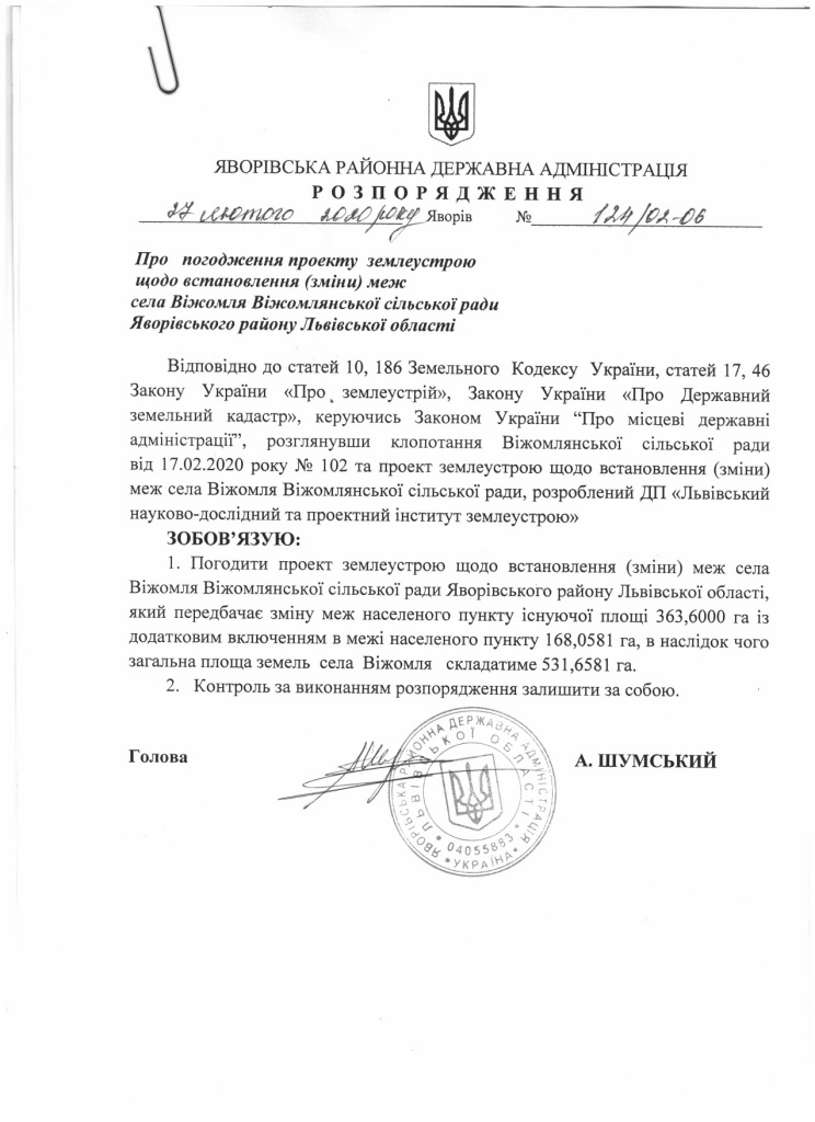 Про погодження проекту землеустрою щодо встановлення (зміни) меж села Віжомля Віжомлянської сільської ради Яворівського району Львівської області |