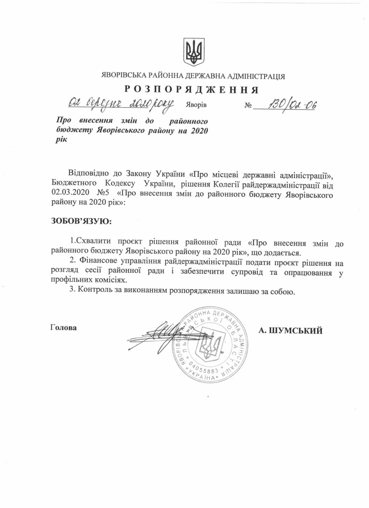 Про внесення змін до районного бюджету Яворівського району на 2020 рік |