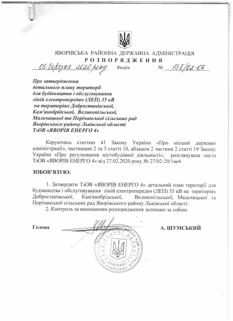 Про затвердження детального плану території для будівництва і обслуговування ліній електропередач (ЛЕП) 35 кВ на території Добростанської, Кам'янобрідської, Великопільської, Мальчицької та Порічанської сільських рад Яворівського району Львівської області ТзОВ "ЯВОРІВ ЕНЕРГО 4" |