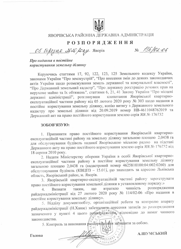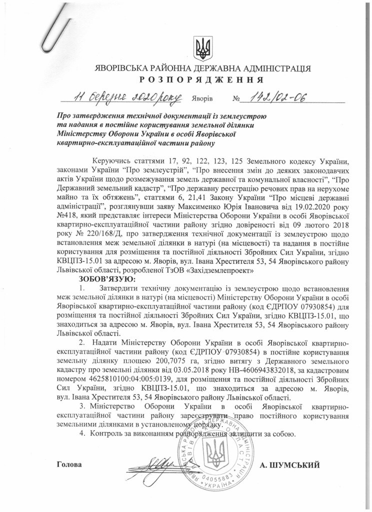 Про затвердження технічної документації із землеустрою та надання в постійне користування земельної ділянки Міністерству Оборони України в особі Яворівської квартирно-експлутаційної частини району |