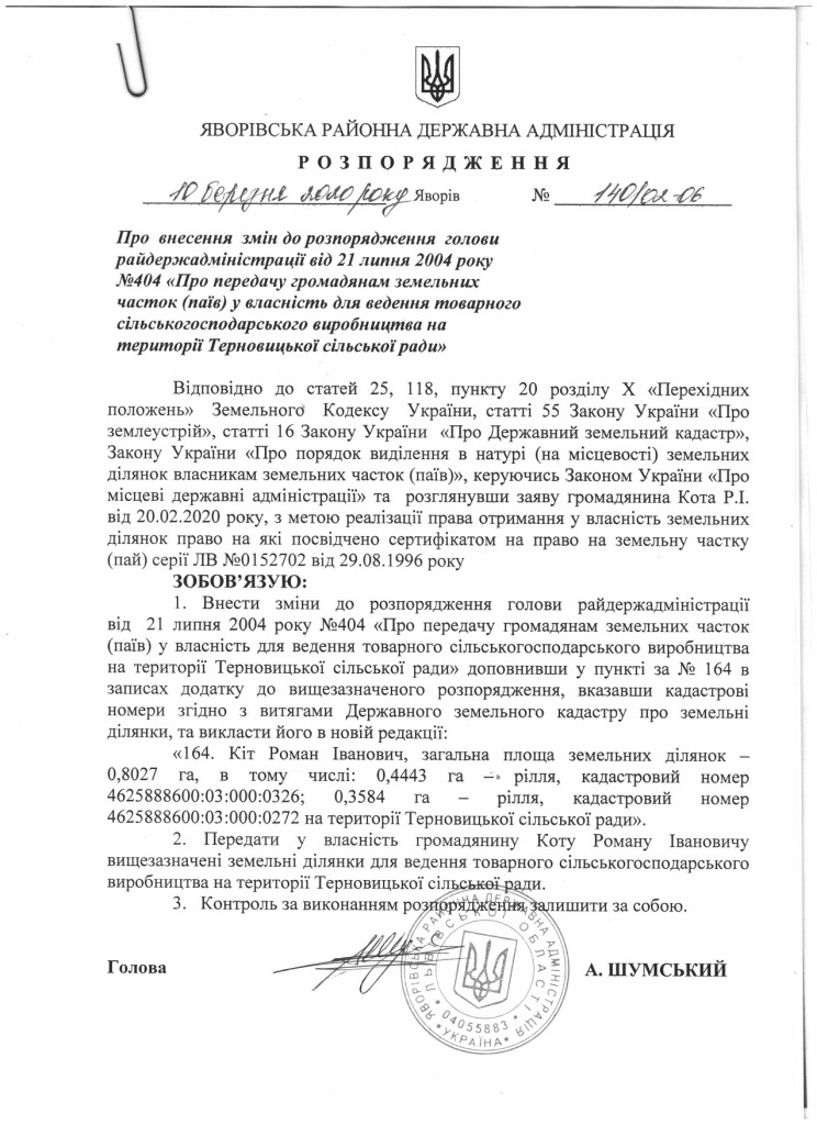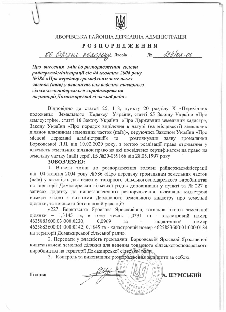 Про внесення змін до розпорядження голови райдержадміністрації від 04 жовтня 2004 року "586 "Про передачу громадянам земельних часток (паїв) у власність для ведення товарного сільськогосподарського виробництва на території Домажирської сільської ради" |
