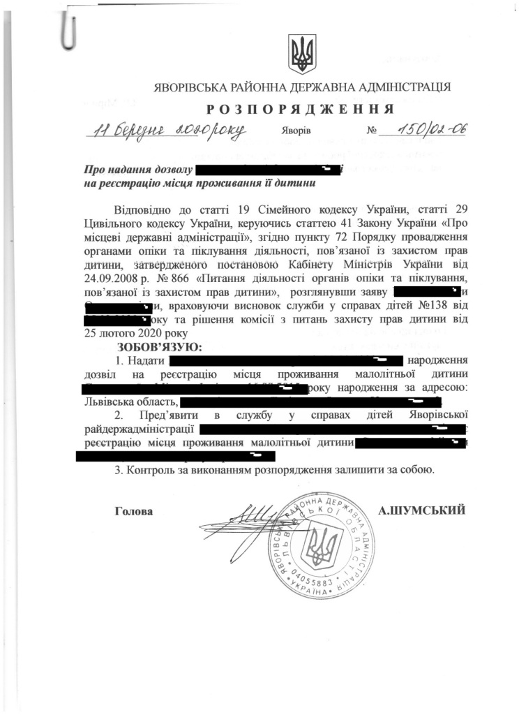 Про надання дозволу на реєстрацію місця проживання її дитини |