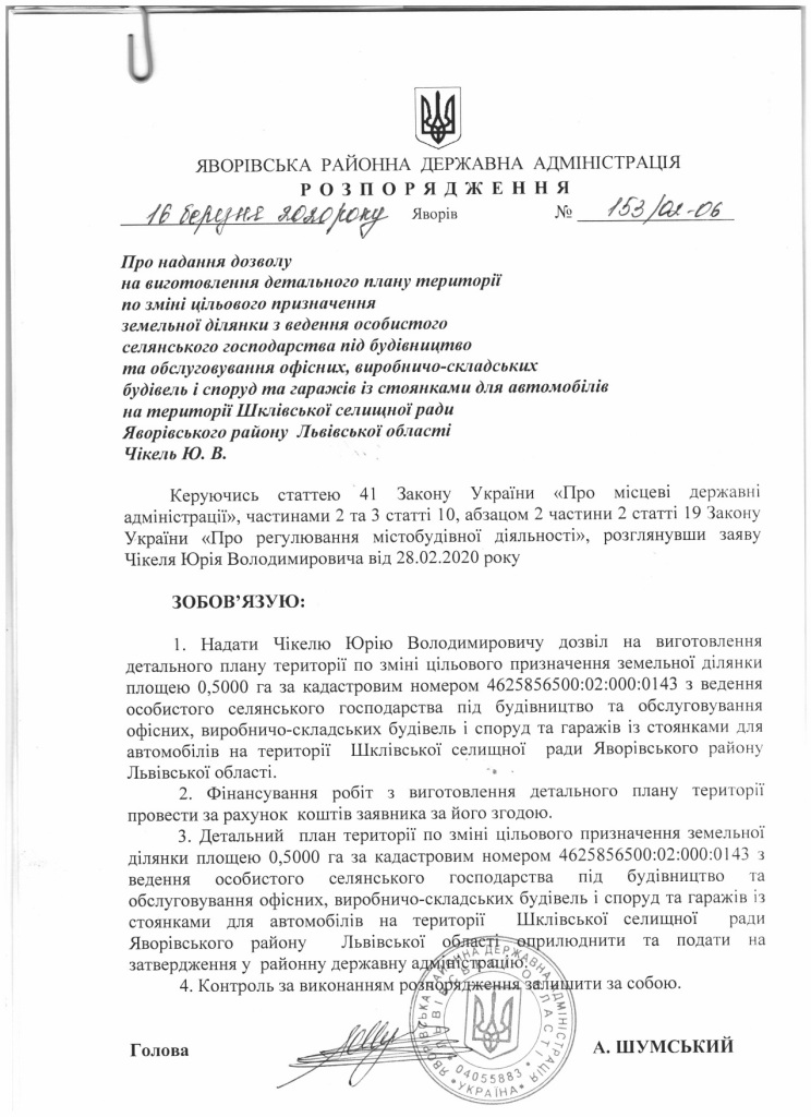 Про надання дозволу на виготовлення детального плану території по зміні цільового призначення земельної ділянки з ведення особистого селянського господарства під будівництво та обслуговування офісних, виробничо-складських будівель і споруд та гаражів із стоянками для автомобілів на території Шклівської селищної ради Яворівського району Львівської області |