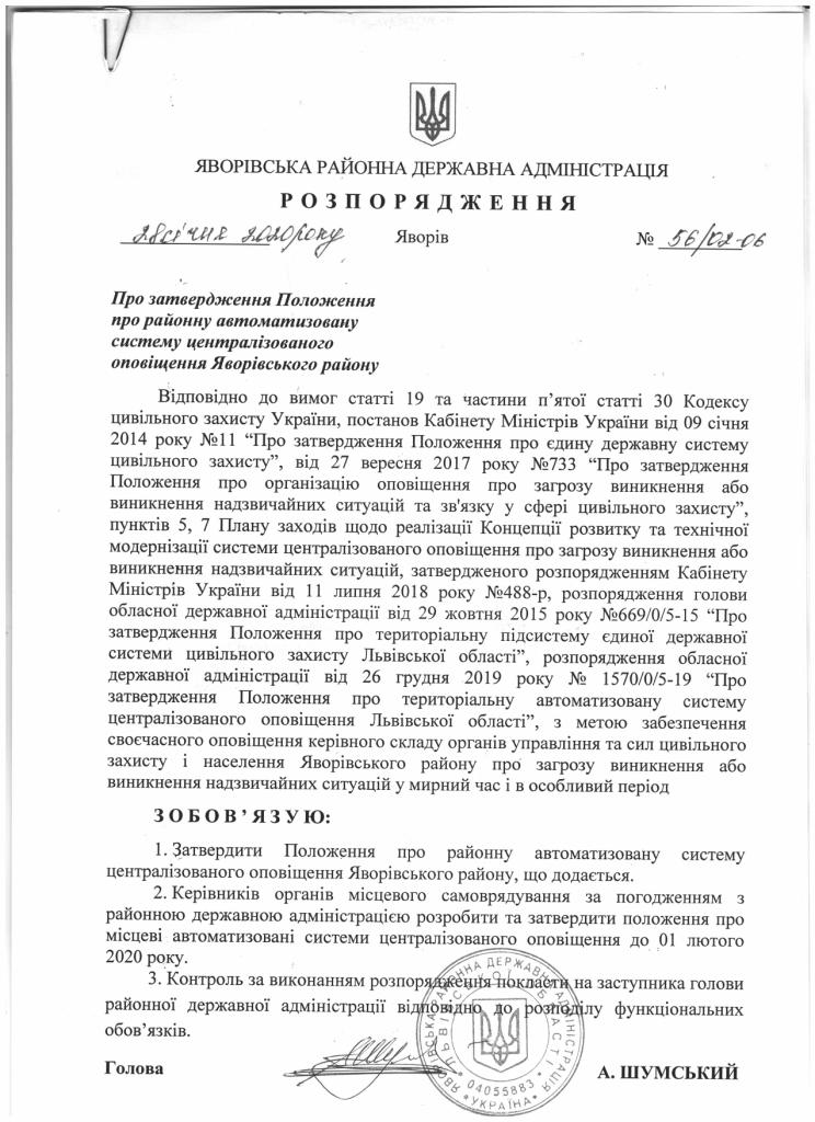 56/02-06 2020-01-28 Про затвердження Положення про районну автоматизовану систему централізованого оповіщення Яворівського ройону