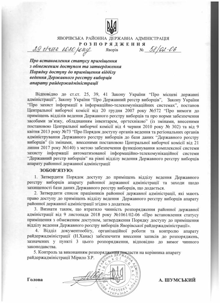 58/02-06 2020-01-29 Про встановлення статусу приміщення з обмеженим доступом та затвердження Порядку доступу до приміщення відділу ведення Державного реєстру виборців апарату райдержадміністрації