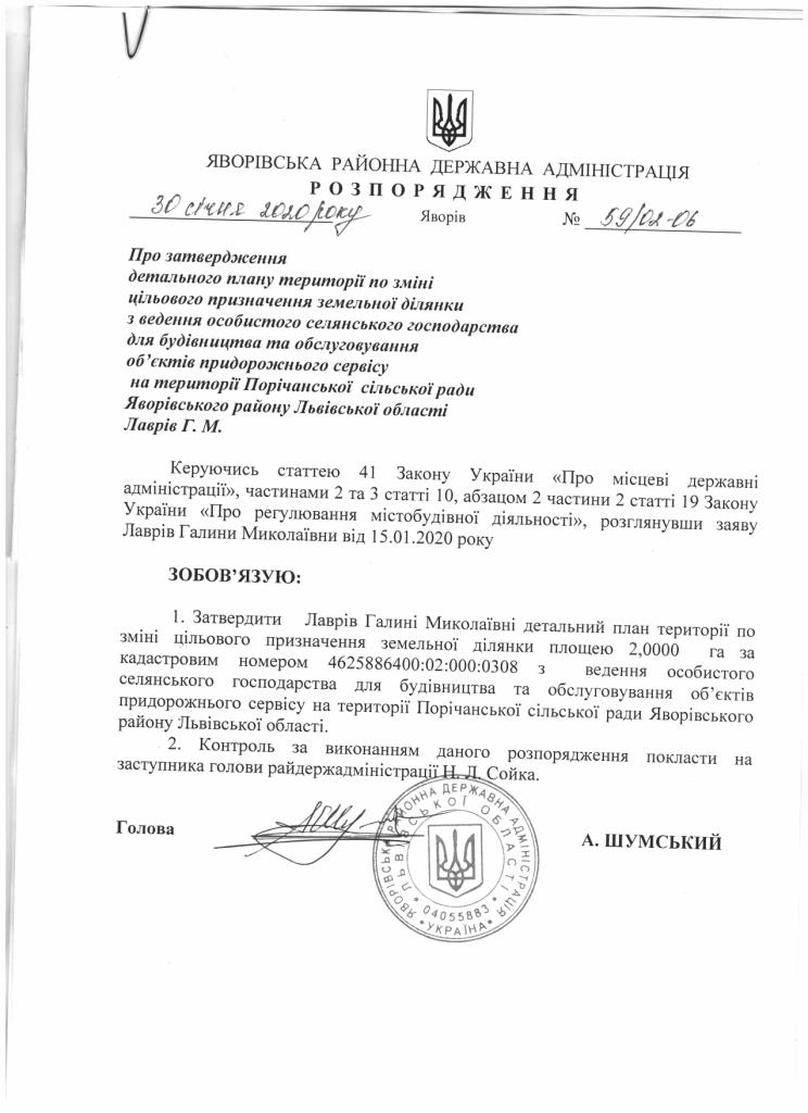 59/02-06 2020-01-30 Про затвердження детального плану території по зміні цільового призначення земельної ділянки з ведення особистого селянського господарства для будівництва та обслуговування об’єктів придорожнього сервісу на території Порічанської сільської ради Яворівського району Львівської області Лаврів Г.М.