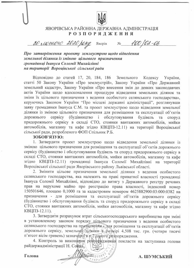 100/2-06 2020-02-20 Про затвердження проекту землеустрою щодо відведення земельної ділянки із зміною цільового призначення громадянці Івануса Соломії Михайлівні на території Вороцівської сільської ради
