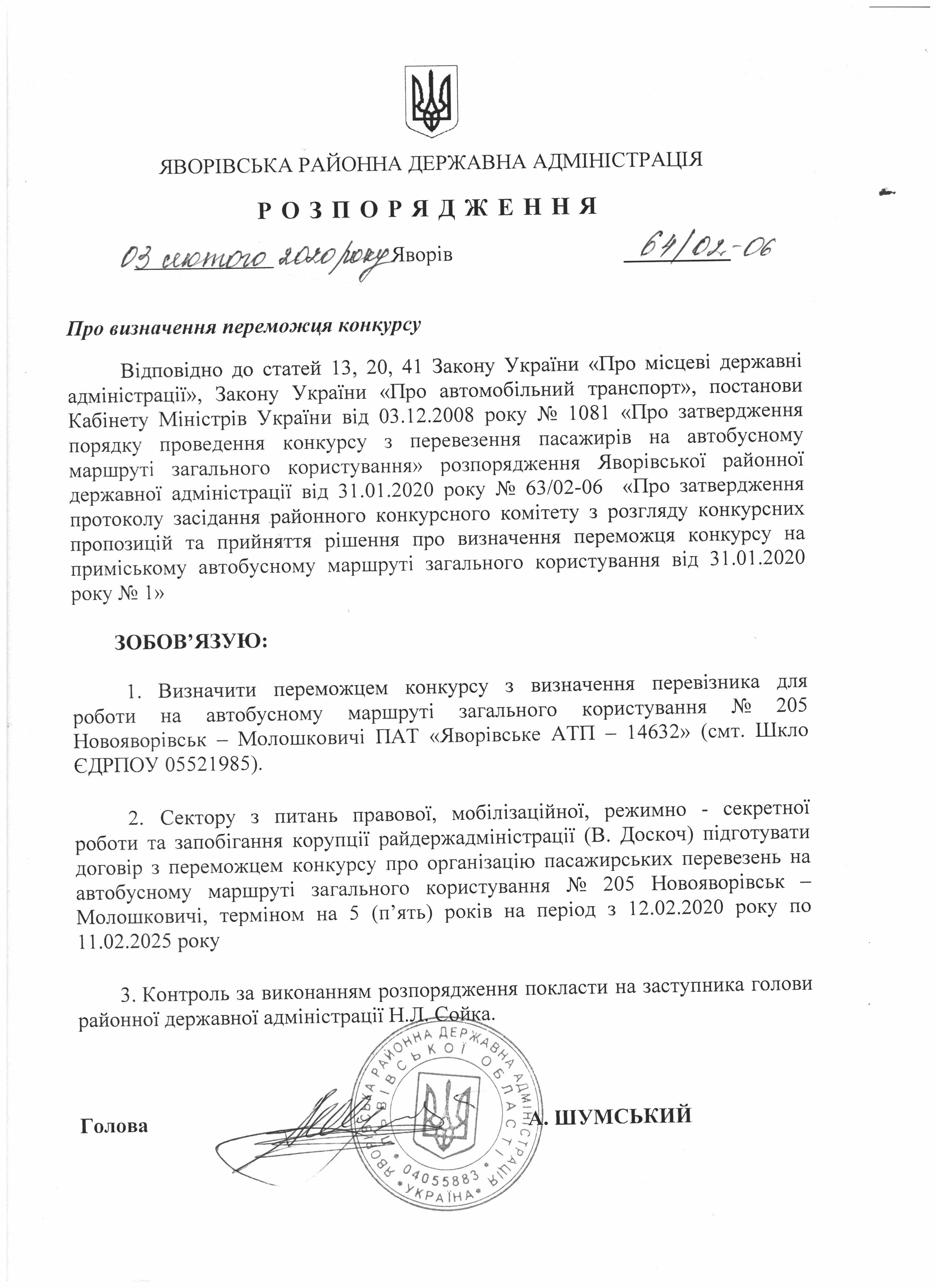 63/02-06 2020-01-31 Про затвердження протоколу засідання районного конкурсного комітету з розгляду конкурсних пропозицій та прийняття рішення про визначення переможця конкурсу на приміському автобусному маршруті загального користування від 31.01.2020 року №1