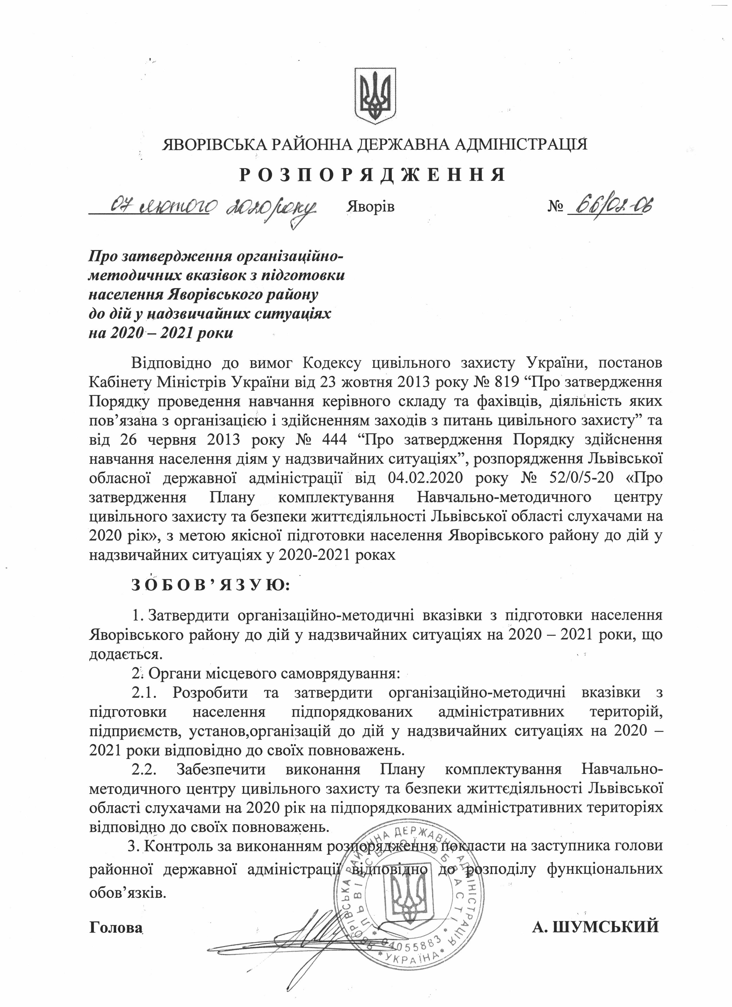 66/02-06 2020-02-07 Про затвердження організаційно-методичних вказівок з підготовки населення Яворівського району до дій у надзвичайних ситуаціях на 2020-2021 роки