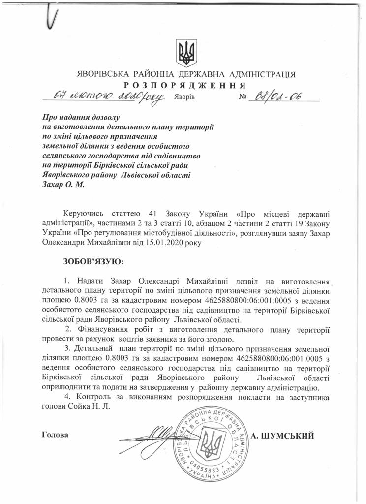 68/02-06 2020-02-07 Про надання дозволу на виготовлення детального плану території по зміні цільового призначення земельної ділянки з ведення особистого селянського господарства під садівництво на території Бірківської сільської ради Яворівського району Львівської області Захар О.М