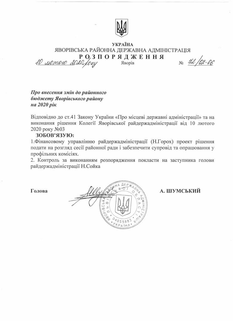 72/02-06 2020-02-10 Про внесення змін до районного бюджету Яворівського району на 2020 рік