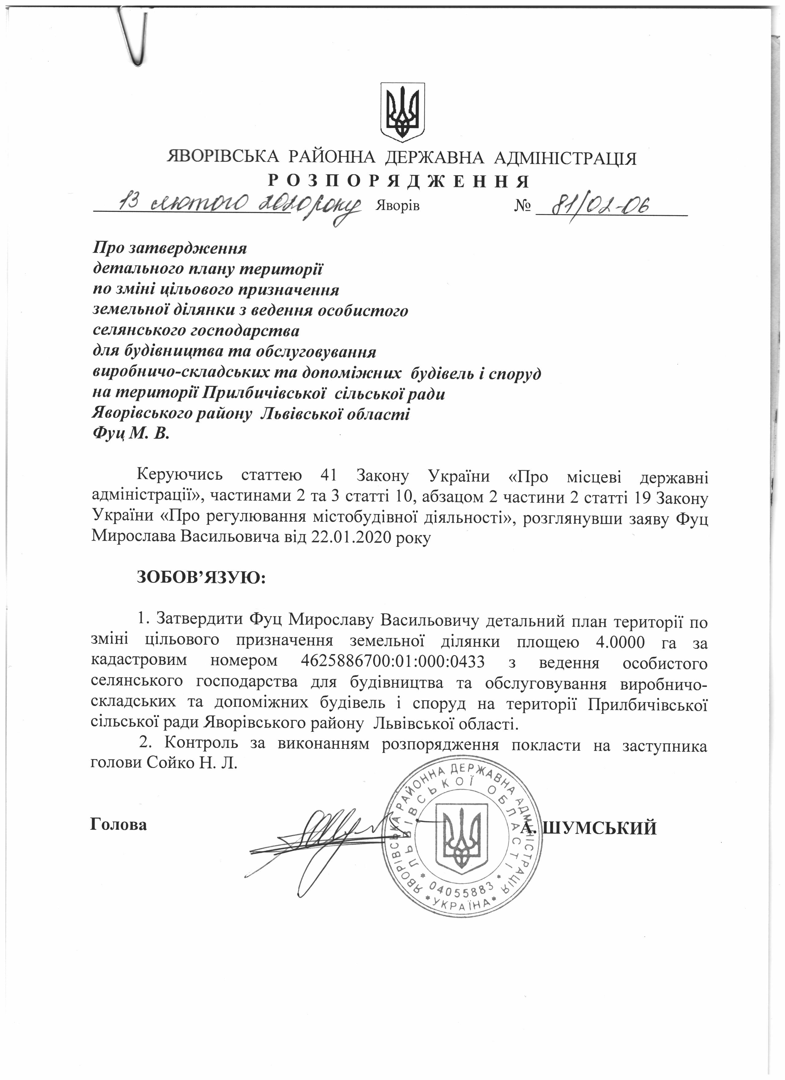 81/02-06 2020-02-13 Про затвердження детального плану території по зміні цільового призначення земельної ділянки з ведення особистого селянського господарства для будівництва та обслуговування виробничо-складських та допоміжних будівель і споруд на території Прилбичівської сільської ради Яворівського району Львівської області Фуц М.В.