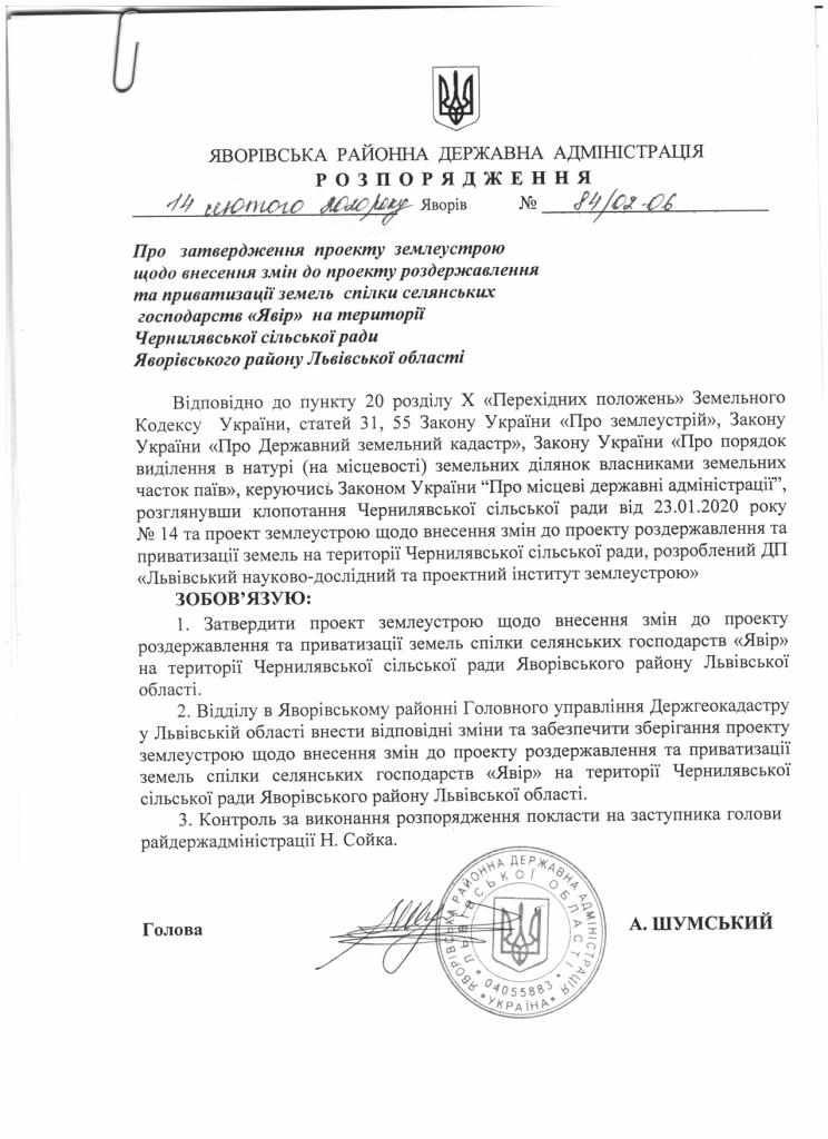 84/02-06 2020-02-14 Про затвердження проекту землеустрою щодо внесення змін до проекту роздержавлення та приватизації земель спілки селянських господарств "Явір" на території Чернилявської сільської ради Яворівського району Львівської області