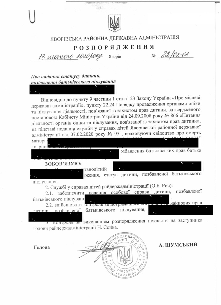 82/02-06 2020-02-13 Про надання статусу дитини, позбавленої батьківського піклування