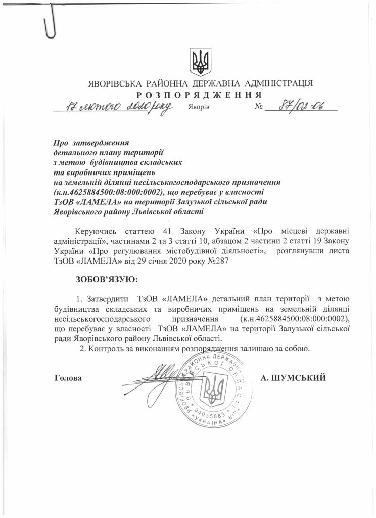 87/02-06 2020-02-17 Про затвердження детального плану території з метою будівництва складських та виробничих приміщень на земельній ділянці несільськогогосподарського призначення