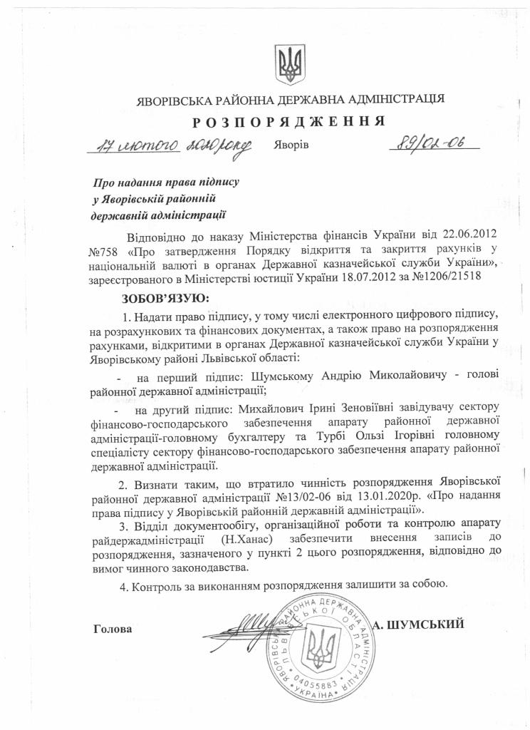 89/02-06 2020-02-17 Про надання права підпису у Яворівській районній державній адміністрації