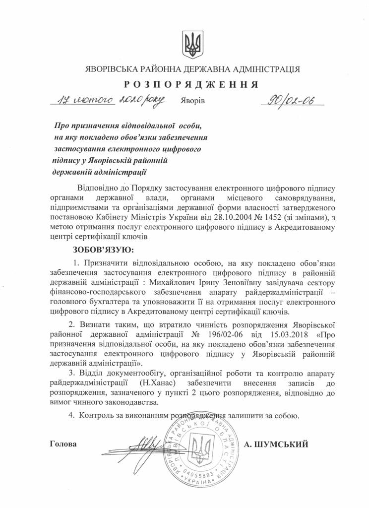 90/02-06 2020-02-17 Про призначення відповідальної особи, на яку покладено обов'язки забезпечення застосування електронного цифрового підпису у Яворівській районній державній адміністрації