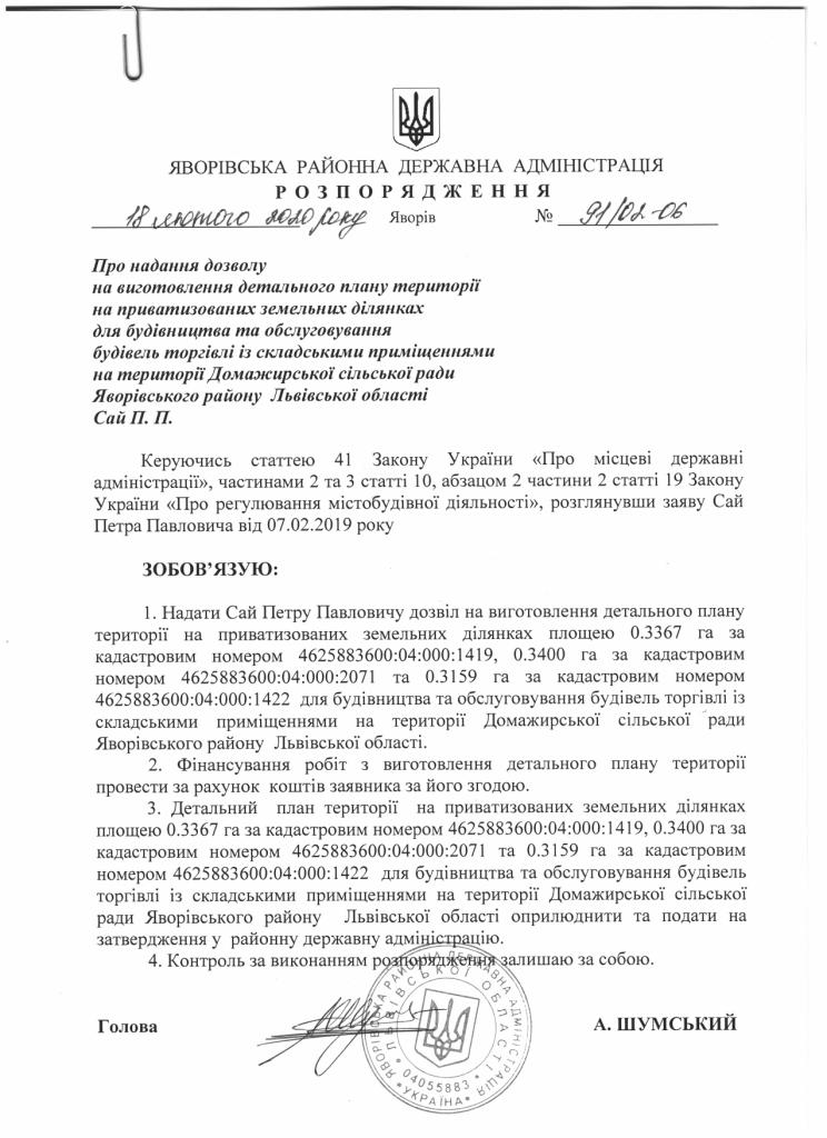 91/02-06 2020-02-18 Про надання дозволу на виготовлення детального плану території на приватизованих земельних ділянках для будівництва та обслуговування будівель торгівлі із складськими приміщеннями на території Домажирської сільської ради