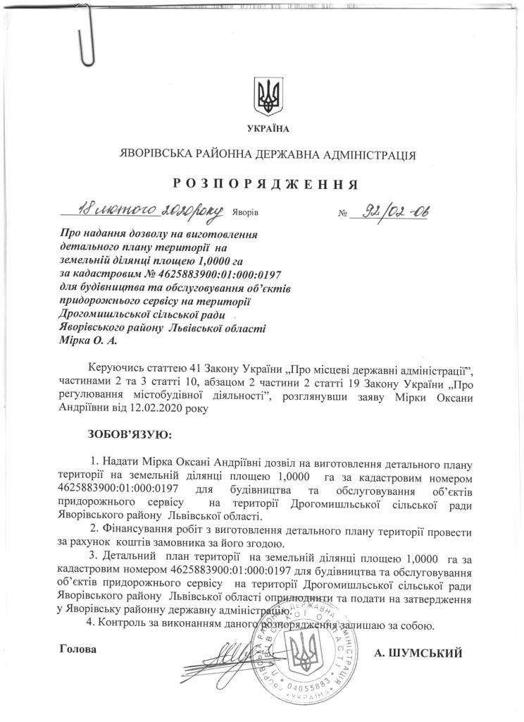 92/02-06 2020-02-18 Про надання дозволу на виготовлення детального плану території на земельній ділянці для будівництва та обслуговування об'єктів придорожнього сервісу на території Дрогомишлянської сільської ради Яворівського району Львівської області
