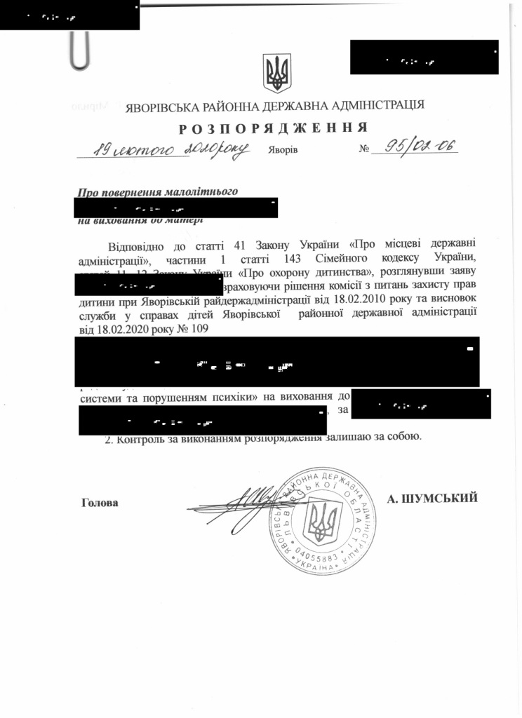 95/02-06 2020-02-19 Про повернення малолітнього на виховання до матері