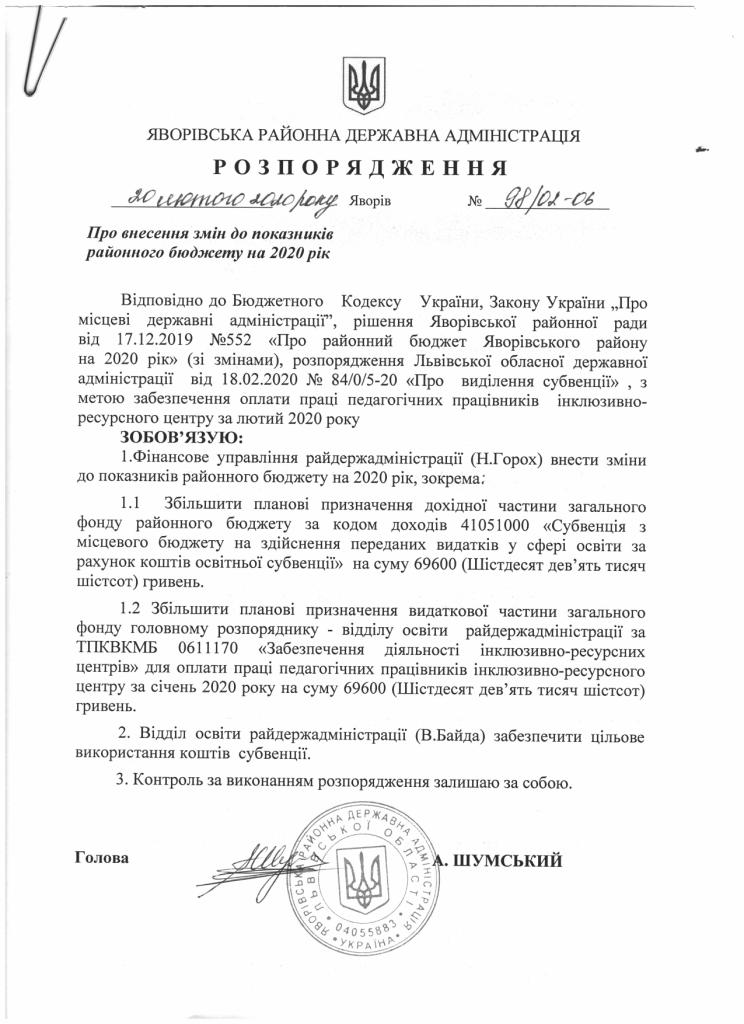 98/02-06 2020-02-20 Про внесення змін до показників районного бюджету на 2020 рік