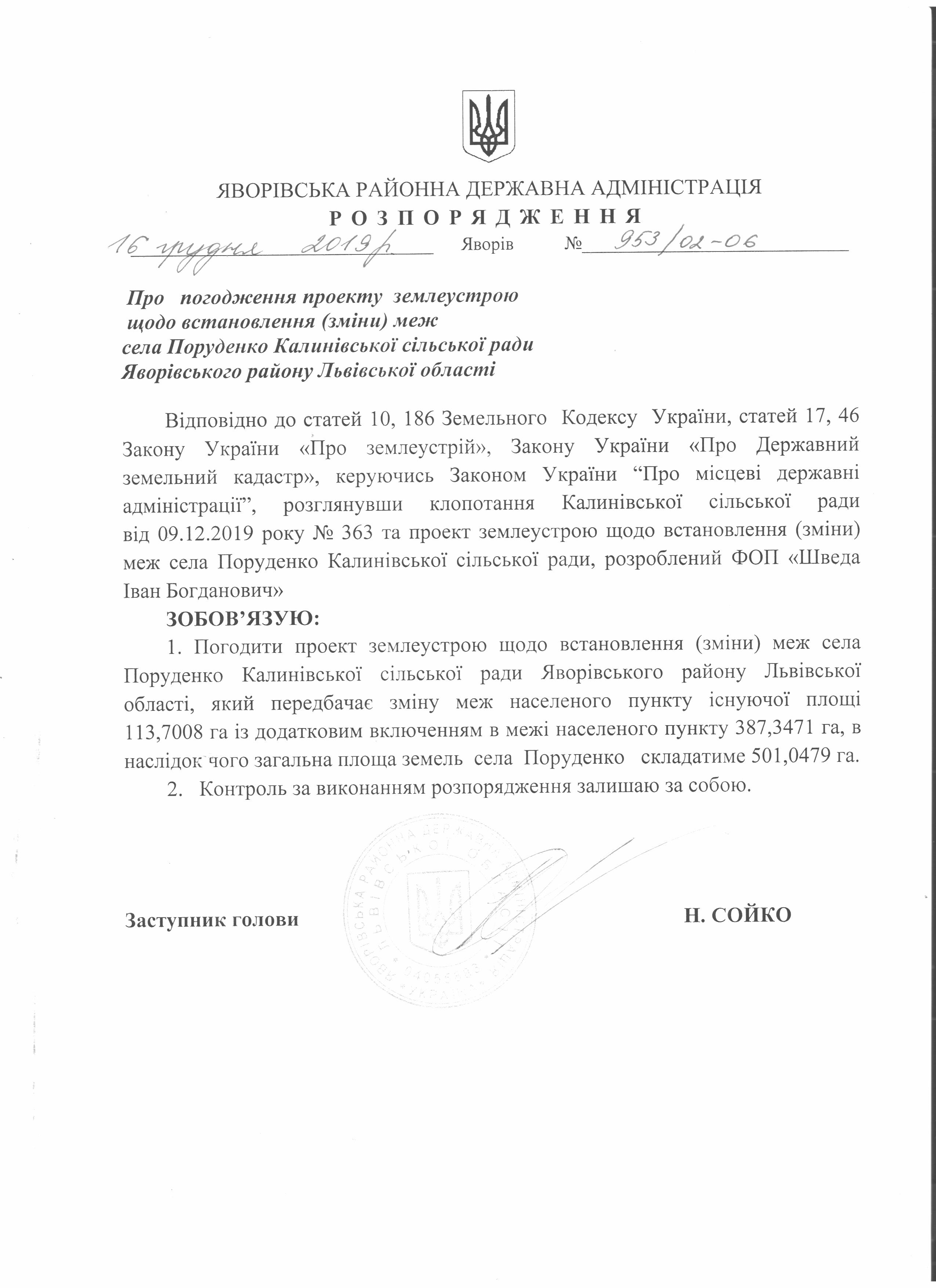 №953/02-06 2019-12-18 Про погодження проекту землеустрою щодо встановлення (зміни) меж села Поруденко Калинівської сільської ради Яворівського району Львівської області