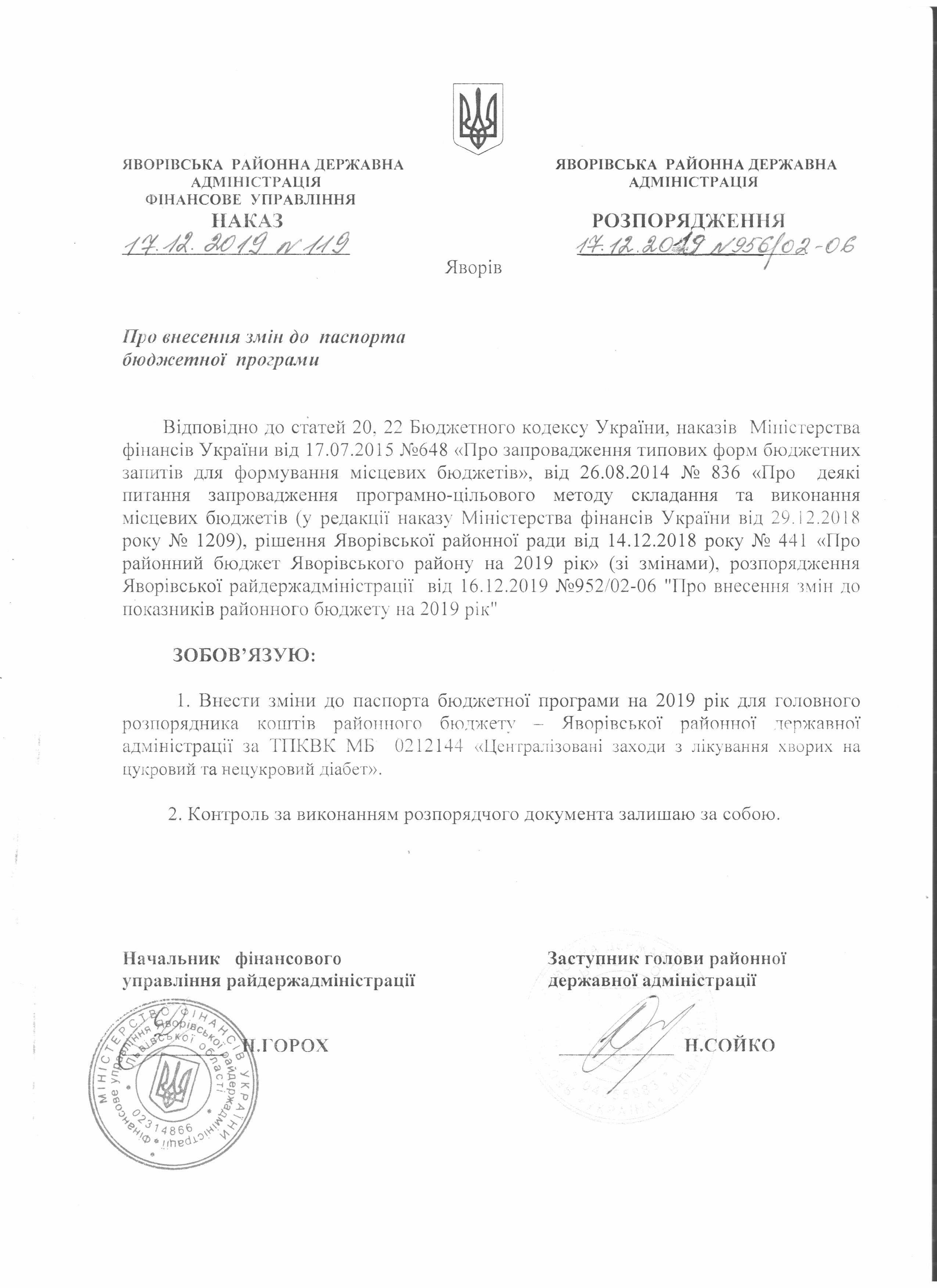 №956/02-06 2019-12-20 Про внесення змін до паспорта бюджетної програми