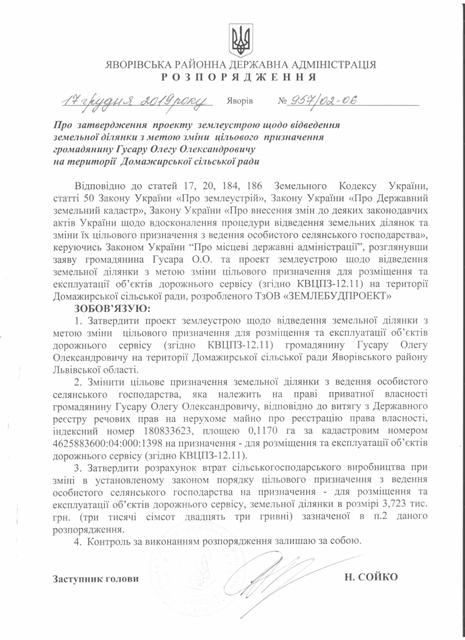 №957/02-06 2019-12-20 Про затвердження проекту землеустрою щодо відведення земельної ділянки з метою зміни цільового призначення громадянину Гусару Олегу Олександровичу на території Домажирської сільської ради.