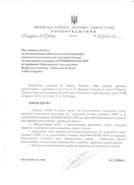 №964/02-06 2019-12-26 Про надання дозволу на виготовлення детального плану території мотельного комплексу на земельній ділянці за кадастровим номером 4625886400:06:001:0059 на території Порічанської сільської ради Яворівського району Львівської області ТзОВ "Страдч"