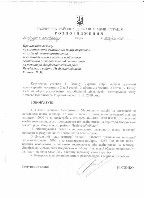 №969/02-06 2019-12-26 Про надання дозволу на виготовлення детального плану території по зміні цільового призначення земельної ділянки з ведення особистого селянського господарства під садівництво на території Яворівської міської ради Яворівського району Львівської області Коновал В.М.