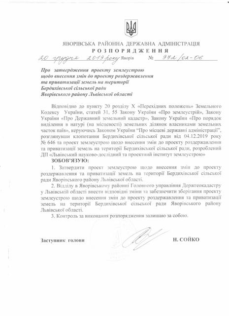 №972/02-06 2019-12-27 Про затвердження проекту землеустрою щодо внесення змін до проекту роздержавлення та приватизації земель на території Бердихівської сільської ради Яворівського району Львівської області.