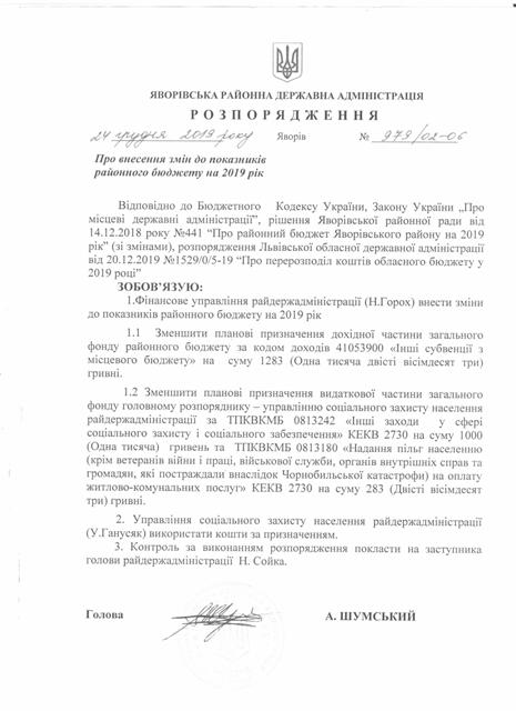 №979/02-06 2019-12-30 Про внесення змін до показників районного бюджету на 2019 рік.