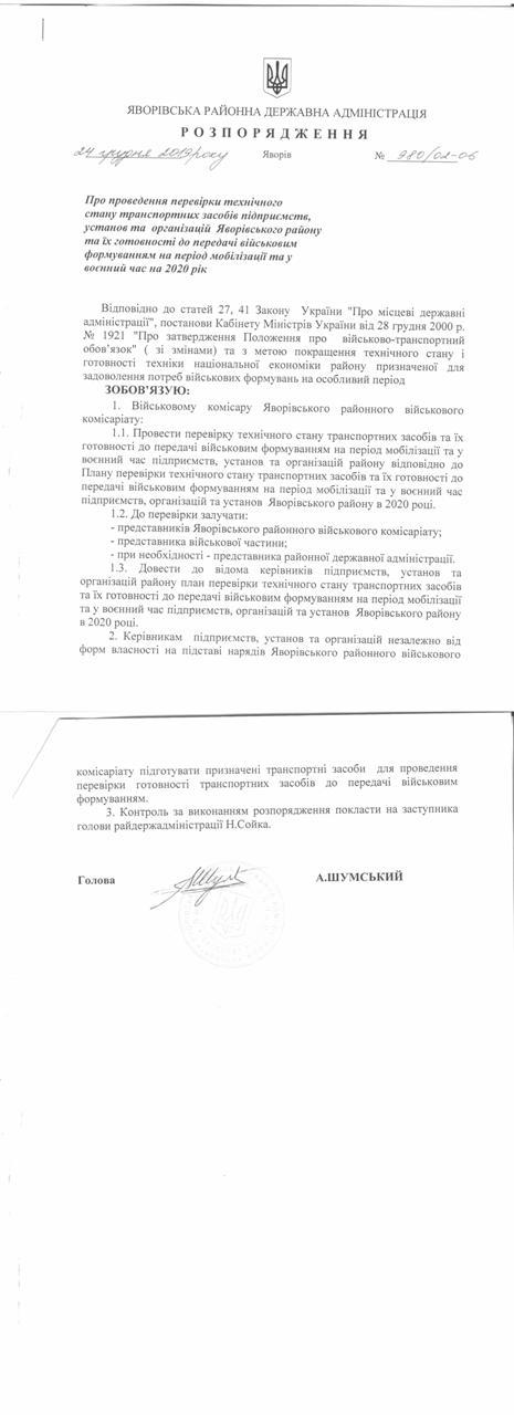 №980/02-06 2019-12-30 Про проведення перевірки технічного стану странспортних засобів підприємств,установ та організації Яворівського району та їх готовності до передачі військовим формуванням на період мобілізації та воєнний час на 2020 рік.