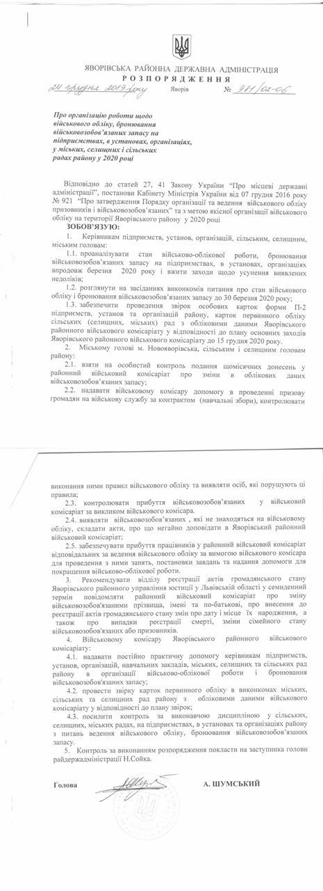 №981/02-06 2019-12-30 Про організацію роботи щодо військового обліку,бронювання військовозобов'язаних запасу на підприємствах,в установах,організаціях,у міських,селищних і сільських радах району у 2020 році.