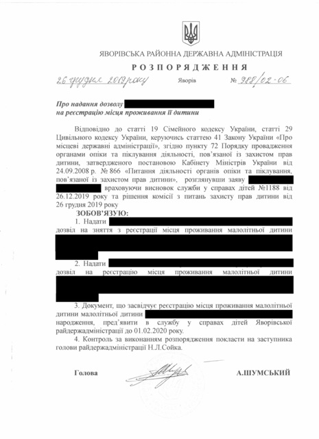 №988/02-06 2019-12-30 Про надання дозволу на реєстрацію місця проживання її дитини.