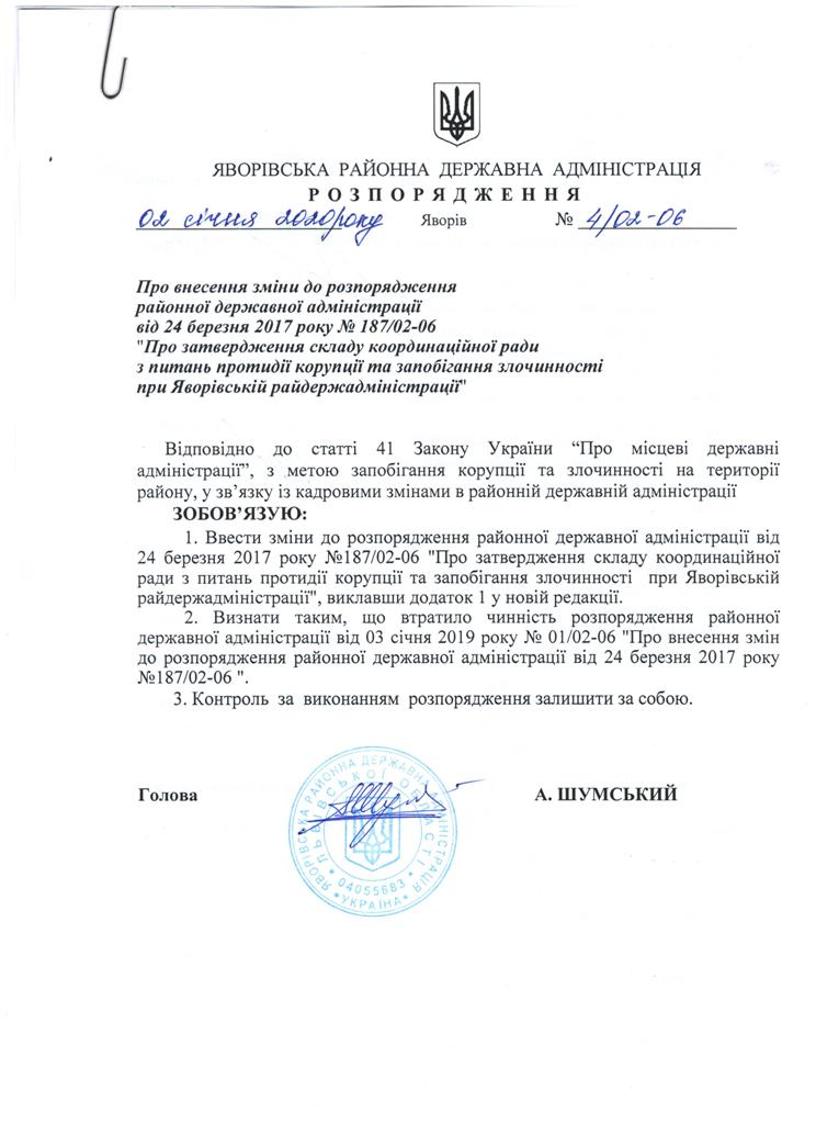 4/02-06 2020-01-02 Про внесення зміни до розпорядження районної державної адміністрації від 24 березея 2017 року №187/02-06 "Про затверскладу координаційної ради з питань протидії корупції та запобігання при Яворівської райдержадміністрації"