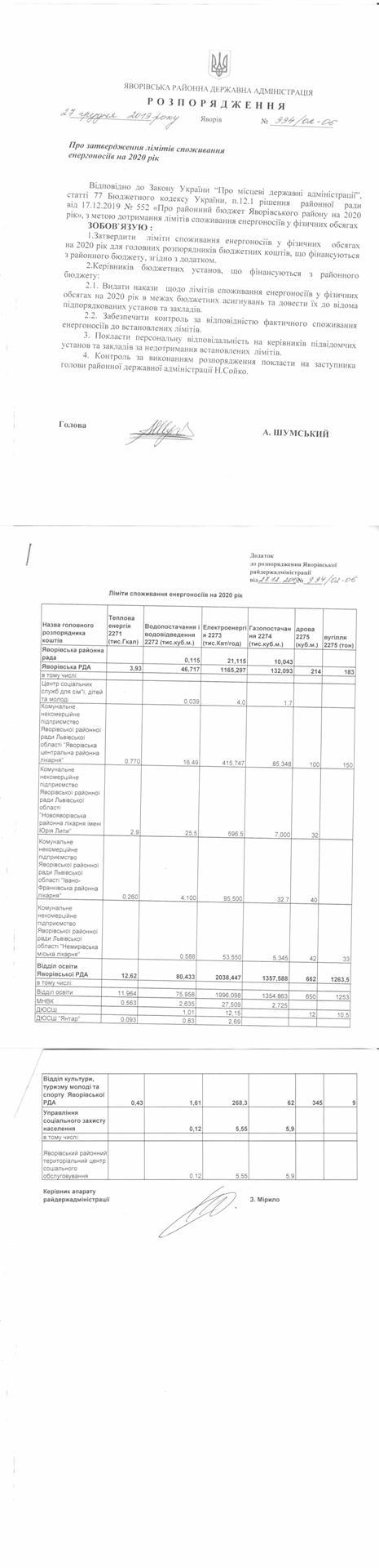 №994/02-06 2019-12-30 Про затвердження лімітів споживання електроносіїв на 2020 рік.