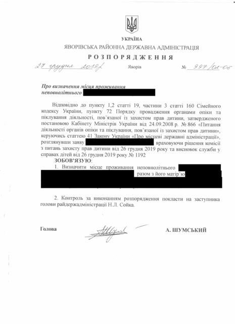 №997/02-06 2019-12-30 Про визначення місця проживання неповнолітнього.