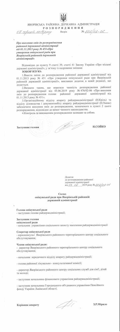 №606/02-06 2019-08-12 Про внесення змін до розпорядження районної державної адміністрації від 01.11.2013 року № 451 " Про утворення опікунської ради при Яворівській районній державній адміністрації"
