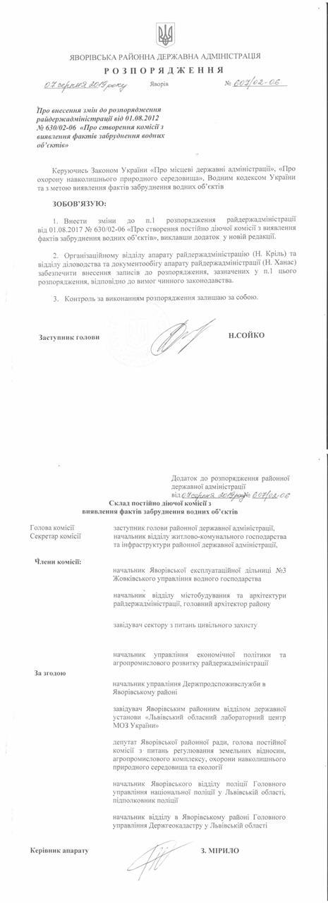 №607/02-06 2019-08-12 Про внесення змін до розпорядження райдержаадміністрації від 01.08.2012 року № 630/02-06 " Про створення комісії з виявлення фактів забруднення водних об"єктів"